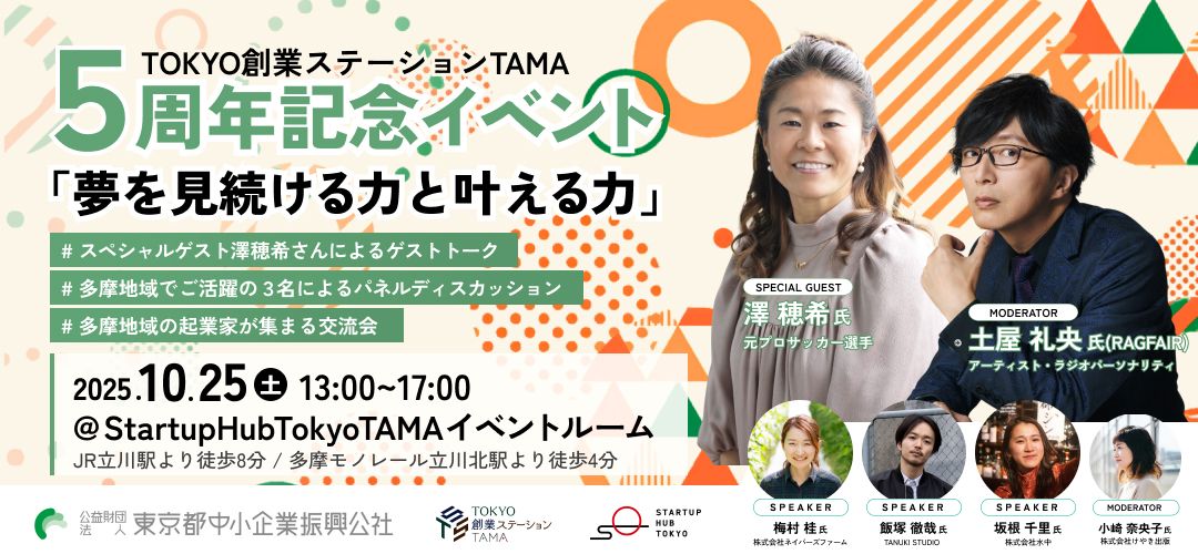 「TOKYO創業ステーションTAMA」の開設5周年を記念し、多摩地域にゆかりのある著名人・経営者の方と共に、多摩地域の起業・創業を盛り上げるイベント。サッカー女子元日本代表やミュージシャンを招いたトークイベントの他、東京の地域経済の活性化に貢献する多摩地域で活躍するキーパーソンによるパネルディスカッションも。
