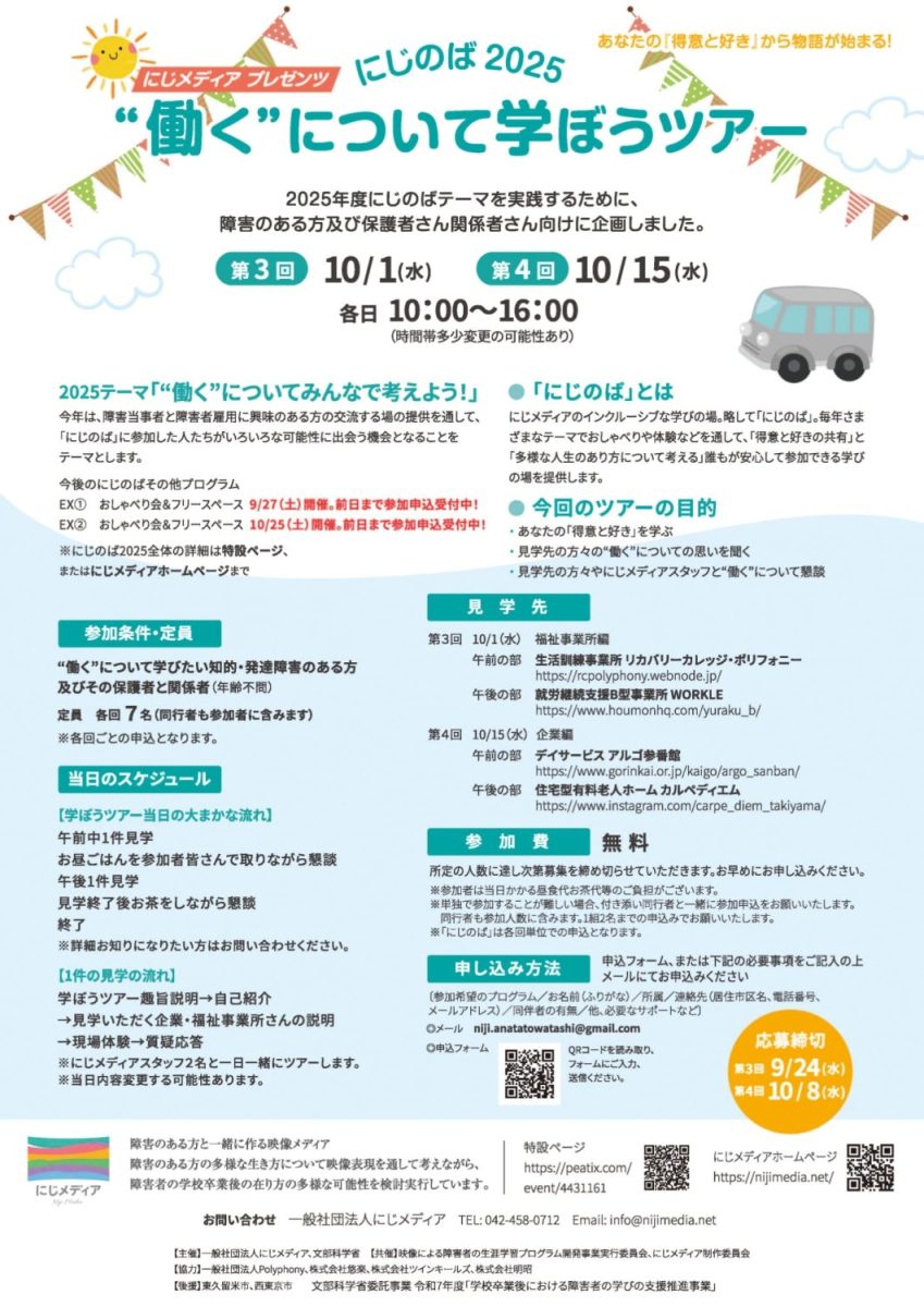 “働く”について学びたい知的・発達障害のある方およびその保護者と関係者を対象に行われる、にじメディアのツアーイベント。定員があるのでお申し込みはお早めに。