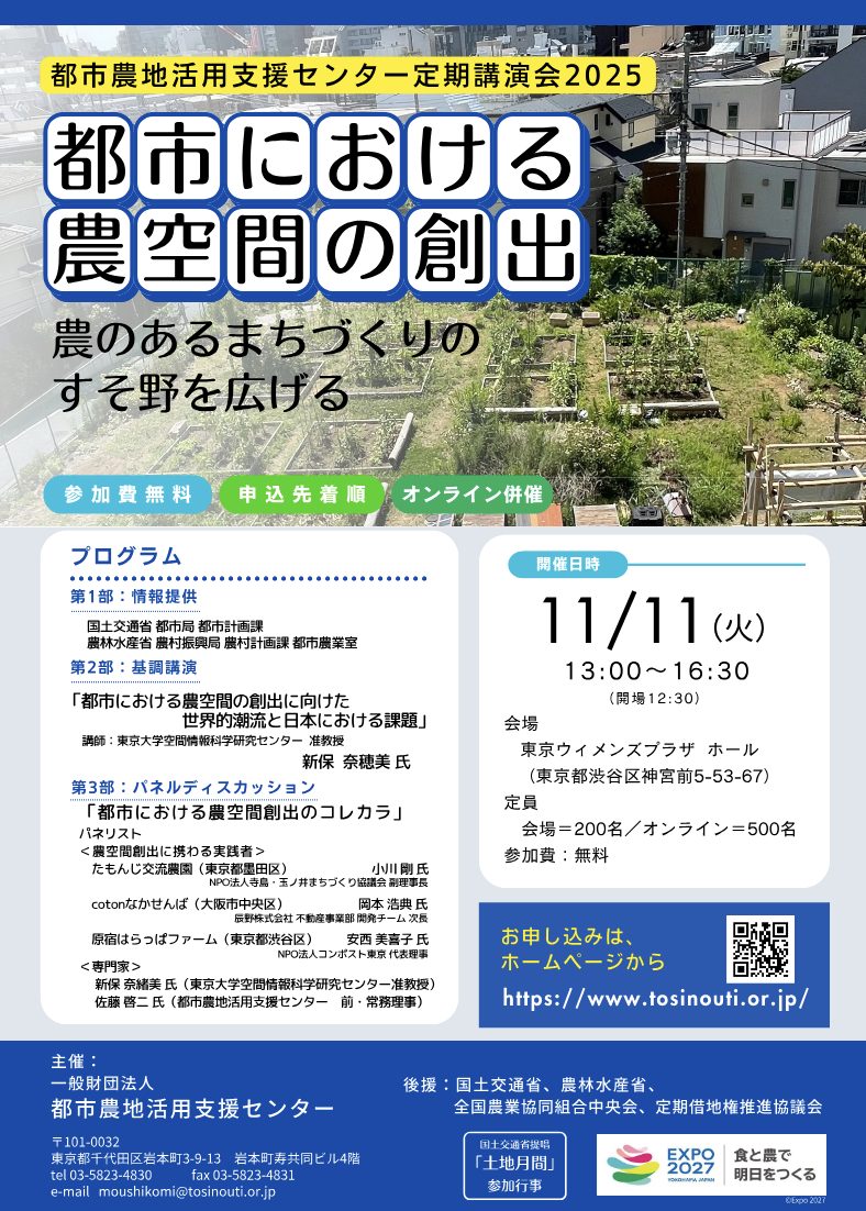 都市における貴重な資源である農地の役割と利用・保全のあり方を考えるイベント。今年は、近年、元々農地でない空地や屋上等に菜園等の農空間が創出されることが多くなってきたことを踏まえ、これからの農のあるまちづくりの裾野を広げていく視点として「都市における農空間の創出」をテーマに開催します。