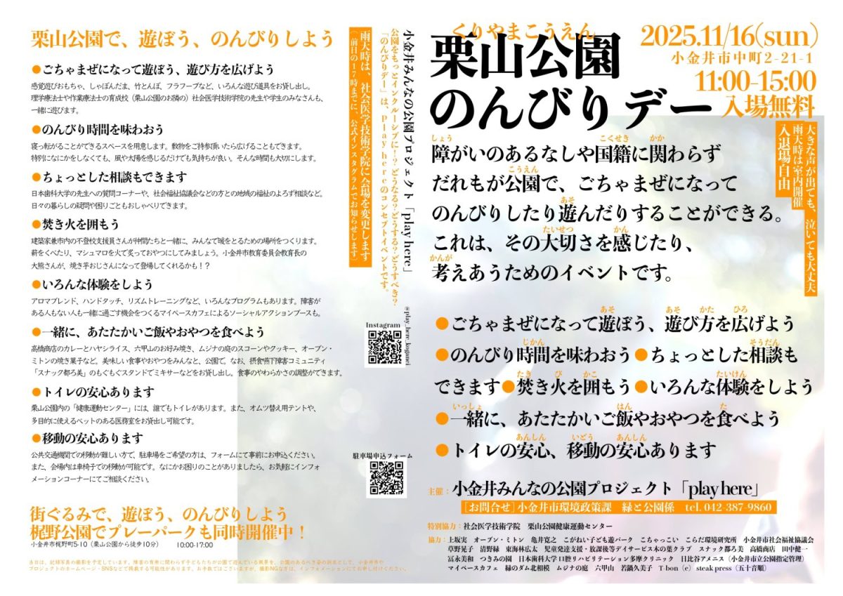 障がいのあるなしや国籍に関わらず、誰もが公園でごちゃまぜになってのんびりしたり遊んだりすることができる。その大切さを感じたり、考えあうためのイベント。熊井晃史さんがディレクターをつとめる小金井みんなの公園プロジェクトplay hereが主催。ムジナの庭も協力。
