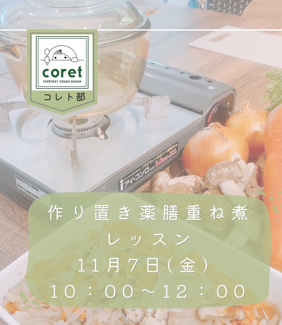 旬の素材を重ねるだけで、身体も心も整えてくれるつくりおき薬膳にトライ。楽しく心と身体が整う食養生の知恵のシェアも。忙しい日も、ちょっと疲れた日も重ね煮で頑張らずにあたたかみある食卓をつくりませんか?ヴィーガンフードにこだわったcoret特製ランチセット・ミニドリンク付きです!